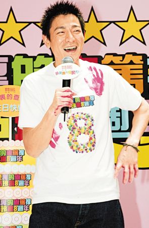 華仔昨日與商臺節(jié)目主持人查小欣為“茶煲里的查篤撐──8路玲瓏8周年”慶祝活動擔任揭幕主禮嘉賓,并親自設計了一件以手印砌成“8”字的T恤,喻意“傳媒圈”和“藝人圈”是互相關連,二人更即場乘升降臺到半空為大型T恤進行“打手印”儀式,為安全起見,商臺亦為二人投保了8位數(shù)字金額。