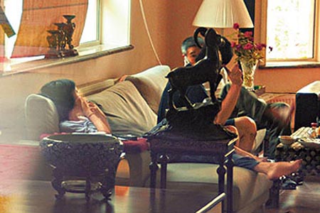 第二日,王菲與李亞鵬在第二日下午四時(shí)先起身,穿住T恤長(zhǎng)褲,人字拖的王菲,與短衫短褲的李亞鵬由二樓睡房下到地下客廳,懶慵慵身貼身“攤”在巨型梳化上,“腳印印”看電視送“早餐”。由于二人婚前已同居一段時(shí)間,所以感覺相當(dāng)老夫老妻。當(dāng)發(fā)現(xiàn)有記者拍照時(shí),王菲反應(yīng)相當(dāng)敏捷,即時(shí)通知老公,并用手掩面,因不防有此一招,原本吊在她腳尖上的人字拖,亦在慌忙中飛脫落地下。