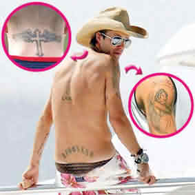 英國球星大衛(wèi)·貝克漢姆的家庭成員——6歲的布魯克林、2歲的羅密歐和5個月的克魯茲,以及妻子維多利亞——都在他身上留有永久的痕跡,不過他身上還有一些宗教色彩的文身,包括一個小天使和一個帶翅膀的十字架,據(jù)這些文身的作者說,“他把這些看做是保護孩子的守護神”。