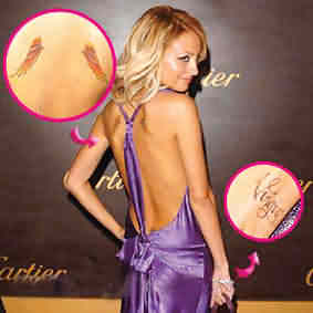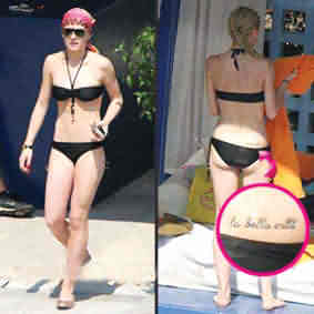 好萊塢新玉女琳賽·洛翰,在后腰部位文了一句意大利語“LaBellaVita”美麗人生,她的發(fā)言人說是為了紀念她2004年去世的祖父,在葬禮上,琳賽朗誦了一首詩,題目就叫《美麗人生》,半年后,她在新奧爾良拍攝電影《JustMyLuck》時文了這個文身。(據(jù)揚子晚報)