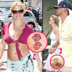 2004年5月,小甜甜布蘭妮和現(xiàn)在的老公凱文·費德林同去愛爾蘭首都都柏林,兩人都在手腕上文了一對骰子圖案,一個紅色、一個藍色,這顯然是個幸運的文身,一周后在返回美國的飛機上,他們訂婚了。