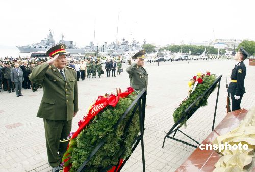 八月十八日,中國解放軍和俄羅斯軍隊的總參謀長梁光烈(左)與巴魯耶夫斯基一起向俄羅斯“太平洋艦隊戰(zhàn)斗榮譽”紀念碑敬獻花圈,向在衛(wèi)國戰(zhàn)爭中英勇犧牲的俄羅斯軍人致以崇高的敬意。作者:王麗南