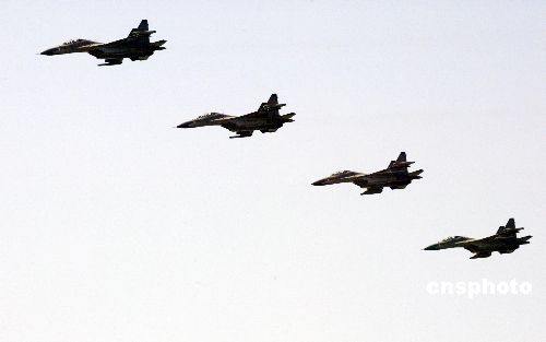 中俄聯(lián)合軍事演習(xí)海上封鎖演練中,蘇-27飛機(jī)以編隊(duì)形式飛過(guò)戰(zhàn)區(qū),與艦艇協(xié)同作戰(zhàn)。作者:王麗南