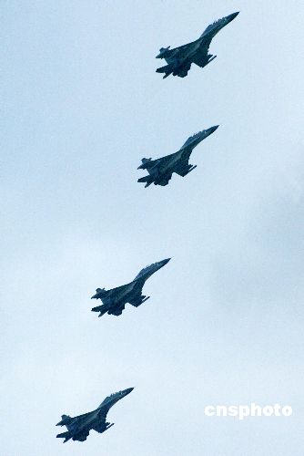| 八月二十四日,“和平使命—2005”中俄聯(lián)合軍事演習(xí)第三階段兩棲登陸作戰(zhàn)實(shí)兵演練在山東半島展開。圖為參加兩棲登陸作戰(zhàn)實(shí)兵演練的中國空軍殲擊機(jī)四機(jī)編隊(duì)飛臨演習(xí)地域上空。作者:王麗南
