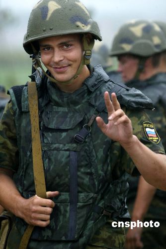 | 八月二十四日,“和平使命—2005”中俄聯(lián)合軍事演習(xí)兩棲登陸作戰(zhàn)實(shí)兵演練在山東半島如期進(jìn)行。圖為完成登陸任務(wù)后的俄羅斯陸戰(zhàn)隊(duì)員,盡管全身濕透,仍中國記者微笑致意。作者:王麗南