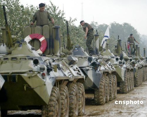 八月二十四日,“和平使命—2005”中俄聯(lián)合軍事演習兩棲登陸作戰(zhàn)實兵演練在山東半島如期進行。圖為完成登陸任務后的俄羅斯陸戰(zhàn)隊員,盡管全身濕透,仍很仔細地檢查車輛性能情況。作者:王麗南