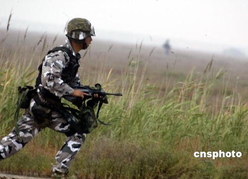 “和平使命-2005”中俄聯(lián)合軍事演習(xí)最后一個實(shí)兵行動課目——強(qiáng)制隔離作戰(zhàn)演練,25日上午在濟(jì)南軍區(qū)濰北靶場舉行。中國空降兵降落地面后奔向目標(biāo)。作者:王麗南