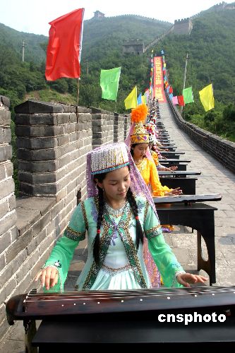八月二十六日,居庸關(guān)長(zhǎng)城琴聲悠揚(yáng),身著56個(gè)民族盛裝的古琴演奏者,在天下第一雄關(guān)用鐫刻著56個(gè)民族歷史文化和風(fēng)情習(xí)俗的56把極品古琴演奏了《梅花三弄》、《流水》、《關(guān)山月》《歌唱祖國(guó)》等千古名曲和時(shí)代新歌,慶祝中華人民共和國(guó)建國(guó)56周年。張勤