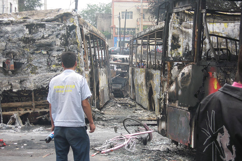 7月6日,烏魯木齊市一位市民注目被犯罪分子焚燒的汽車。在7月5日晚發(fā)生的嚴(yán)重暴力犯罪事件中,被毀車輛達260部。 中新社發(fā) 鐘新 攝