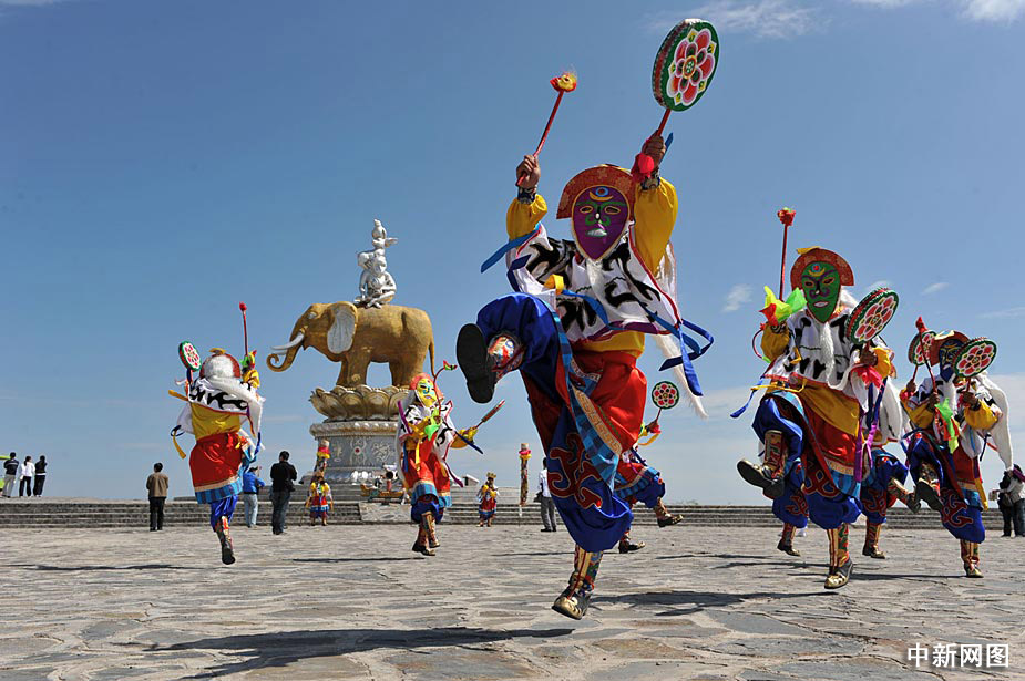 圖為二郎劍景區(qū)的藏族同胞表演藏族舞蹈喇嘛法舞。