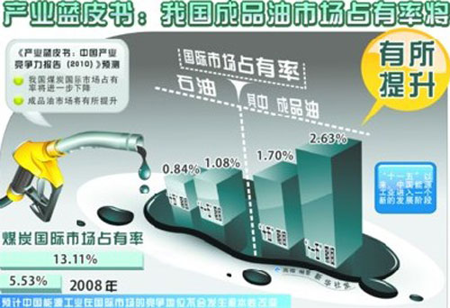 中國(guó)社會(huì)科學(xué)院22日在北京發(fā)布的《產(chǎn)業(yè)藍(lán)皮書:中國(guó)產(chǎn)業(yè)競(jìng)爭(zhēng)力報(bào)告(2010)》預(yù)測(cè),我國(guó)煤炭國(guó)際市場(chǎng)占有率將進(jìn)一步下降,成品油市場(chǎng)將有所提升。