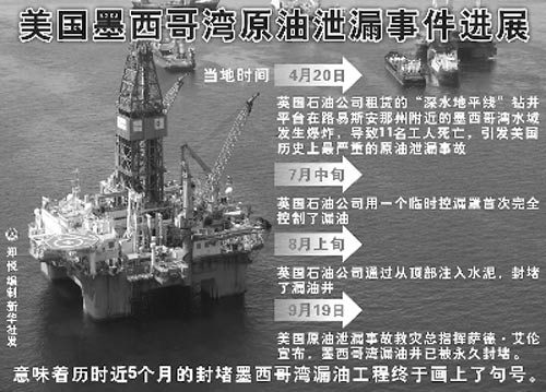 7月12日,作業(yè)人員用一個臨時控油罩“大禮帽10號”成功地“罩”住了漏油井管,并向油井中灌入水泥和海底泥漿,從頂部將漏油井封死。漏油井被成功“封頂”后,英國石油公司又對封堵的效果進行了3天的壓力測試,結(jié)果未發(fā)現(xiàn)明顯異常。監(jiān)控漏油井的攝像頭傳回的畫面也顯示,已沒有新的原油漏出。此前,原油整整泄漏了87天!