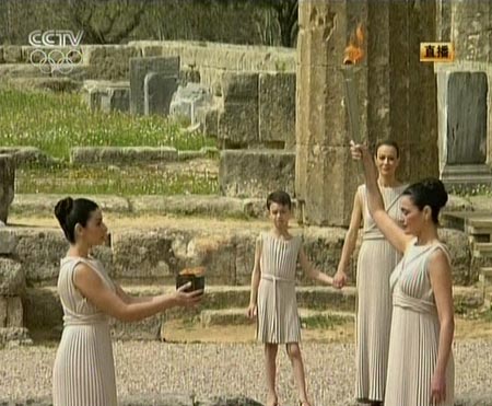 中新網(wǎng)3月24日電 北京時間今天下午5時,北京奧運圣火采集儀式在希臘的赫拉神廟前點燃,希臘演員瑪利亞-娜芙普利都出任最高女祭司。