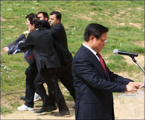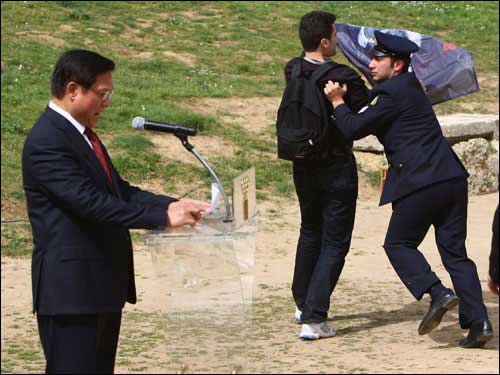 上午十一點,圣火采集儀式正式開始。陽光明媚,暖風習習,古競技場內綠草茵茵,春花爛漫,一切都顯得生機盎然,現(xiàn)場氣氛神圣而祥和。儀式進行了十幾分鐘,北京奧組委主席劉淇上前開始發(fā)表講話,這時,記者看見來賓席上突然躥出一個人,他奔向劉淇,在劉淇身旁展開一個橫幅,另有兩個顯然是他同伙的人也加入進來發(fā)難。但他們迅即被在場的希臘警察制服,并被帶離現(xiàn)場。在這一不到兩分鐘的過程中,劉淇繼續(xù)沉穩(wěn)莊嚴地發(fā)表講話,未受到任何影響。當劉淇主席講話結束和會場傳來北京奧運圣火在赫拉神廟前已點燃的消息時,整個現(xiàn)場響起了雷鳴般的掌聲,在場的人們用這種方式表達了對奧運的熱愛和對北京奧運會的祝福。整個儀式按既定程序進行,那場小鬧劇也成了全世界愛好和平、熱愛奧運的人們的笑柄。