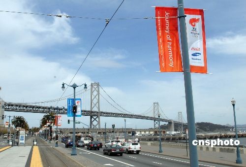 圖:舊金山濱海大道高掛北京奧運(yùn)圣火旗幟