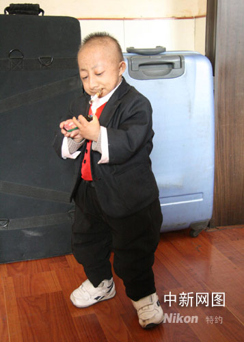 4月14日上午,記者見到了世界第一矮人何平平,他已是吉林省永吉縣曉丹藝術(shù)傳播公司的一名特殊演員。何平平的經(jīng)紀人告訴記者,何平平長的雖然矮小,但智商沒有問題。他平時喜歡看東北二人轉(zhuǎn),喜歡聽歌曲,更喜歡開車,可每次只能站到座位上才能把到方向盤。