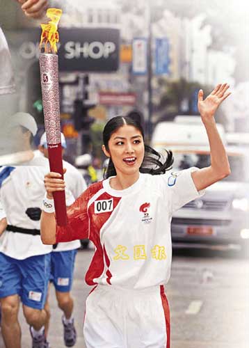 汪明荃昨日盛裝打扮出任火炬手,沿途不斷和市民打招呼。阿姐事后表示,心情興奮。她會(huì)將火炬放在辦公室,她亦表示會(huì)把火炬帶去供天水圍的小朋友拍照,因?yàn)樵谒艿男谐讨,?tīng)到好多小朋友大叫:“加油!中國(guó)加油!”( 植毅儀、李慶全、黃國(guó)強(qiáng))
