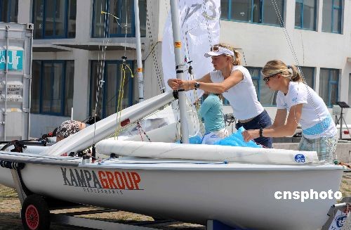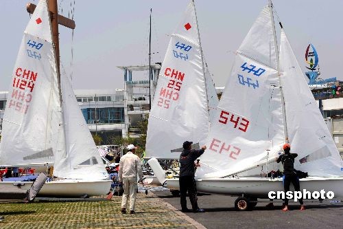 為迎戰(zhàn)二00八北京奧運會帆船比賽,美國帆船對已于近日來到奧運會帆船賽舉辦城市青島的奧帆賽訓練基地,進行賽前的場地適應性訓練。圖為美國帆船隊的隊員們準備下海訓練。 中新社發(fā) 曲連遵 攝