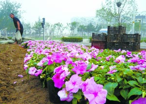 記者上午在鳥巢前看到,滿載著奧運(yùn)花卉的卡車已經(jīng)陸續(xù)進(jìn)場,工人們將一袋袋的營養(yǎng)土鋪撒在空地上,一盆盆粉紅色的矮牽牛擁簇在一起,很快就形成了幾個美麗的S形。