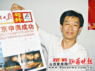 昨日,運城收藏愛好者陳國慶的奧運系列收藏又添珍品:原國際奧委會主席薩馬蘭奇在他寄去的報道奧運申辦成功的《人民日報》號外簽名,并給陳國慶親筆回信!白蛉障挛纾沂盏剿_馬蘭奇的信件后,別提有多高興了!苯袢赵绯,記者見到陳國慶時,他仍沉浸在喜悅中。今年39歲的陳國慶是中保財險運城分公司的員工,十多年前迷上了收藏,尤其對報紙創(chuàng)刊號和號外情有獨鐘。