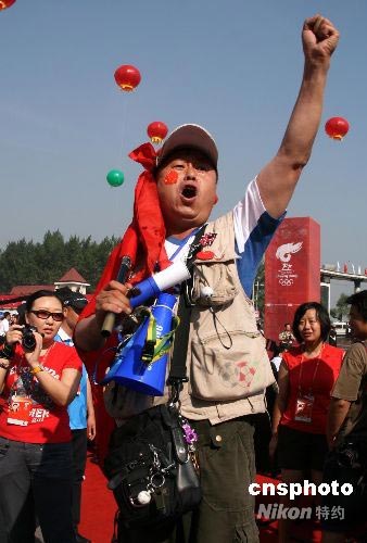 7月11日,北京奧運火炬在哈爾濱傳遞。在起跑儀式現(xiàn)場,被稱為“哈爾濱第一球迷”的老崔,指揮當(dāng)?shù)孛癖姙閵W運火炬?zhèn)鬟f吶喊助威。 中新社發(fā) 周兆軍 攝