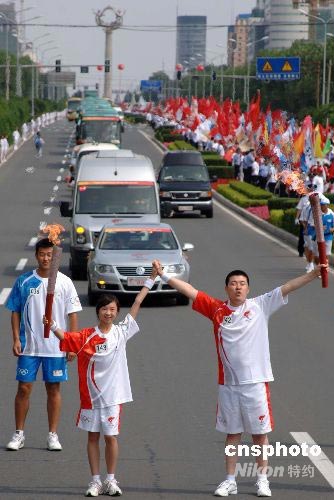 7月14日,奧運(yùn)火炬在吉林長(zhǎng)春傳遞。圖為火炬手東北師大附小學(xué)生袁萌(左)和火炬手王洪巖交接火炬。 中新社發(fā) 廖攀 攝