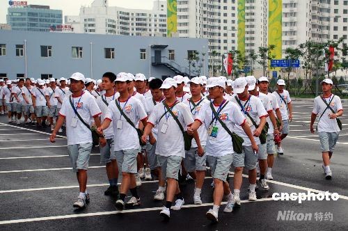 7月15日早上,駐京海軍某部300名官兵身著統(tǒng)一服裝到鳥(niǎo)巢參加奧運(yùn)開(kāi)幕式彩排。據(jù)了解,北京奧組委采取嚴(yán)格的保密措施防止開(kāi)幕式節(jié)目?jī)?nèi)容泄露,為此“鳥(niǎo)巢”外圍戒備森嚴(yán),共有三層隔離護(hù)欄,由公安、武警把守!傍B(niǎo)巢”上空的制高點(diǎn)也被全面封鎖,防止高空偷拍。 中新社發(fā) 楊慧峰 攝