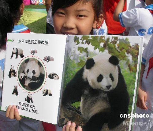 7月16日上午,全球首本由奧運大熊貓“晶晶”擔任主角的科普圖書——《我是晶晶-熊貓成長寫真》中文版在成都大熊貓繁育研究基地舉行了全球首發(fā)儀式。該書歷時兩年策劃、設計,由企鵝集團著名的多林金德斯利公司著,童趣出版有限公司編譯,人民郵電出版社出版發(fā)行。為表達對震后四川、成都的關愛,該書的全球首發(fā)儀式安排在成都舉行。中新社發(fā) 楊杰 攝