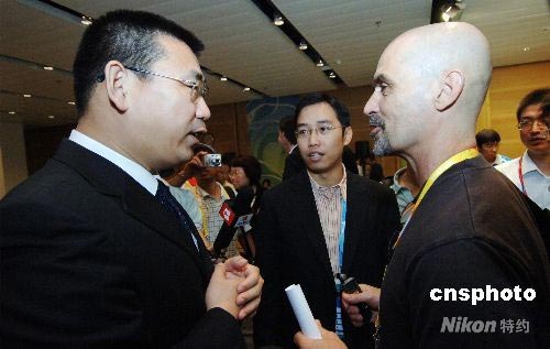 7月16日,北京奧組委志愿者部部長(zhǎng)劉劍(左)邀請(qǐng)美聯(lián)社記者斯蒂芬來(lái)北京作奧運(yùn)志愿者,并邀請(qǐng)他喝北京的豆汁。當(dāng)日,北京奧組委志愿者部相關(guān)官員在北京奧運(yùn)主新聞中心向中外記者介紹奧運(yùn)志愿者籌備的相關(guān)情況。中新社發(fā) 王東明 攝
