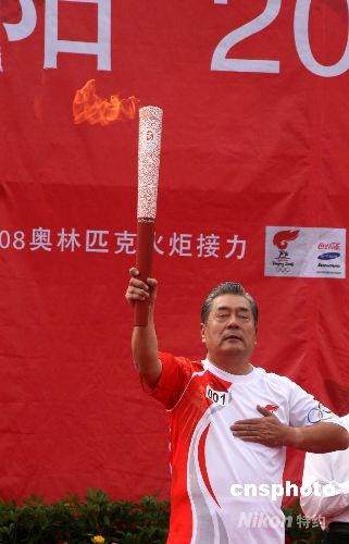 7月17日,北京奧運(yùn)火炬在沈陽(yáng)傳遞,第一棒火炬手是“中國(guó)奧運(yùn)第一人”劉長(zhǎng)春的次子劉鴻圖。三個(gè)月前,他的哥哥劉鴻亮參加了北京奧運(yùn)火炬在希臘的傳遞活動(dòng)。劉鴻圖接過(guò)第一棒火炬后,手撫胸口閉目默念。他在接受記者采訪時(shí)說(shuō),他用這種方式告慰先父,由他開(kāi)啟的中國(guó)人的百年奧運(yùn)夢(mèng)想終于實(shí)現(xiàn)了。中新社發(fā) 周兆軍 攝