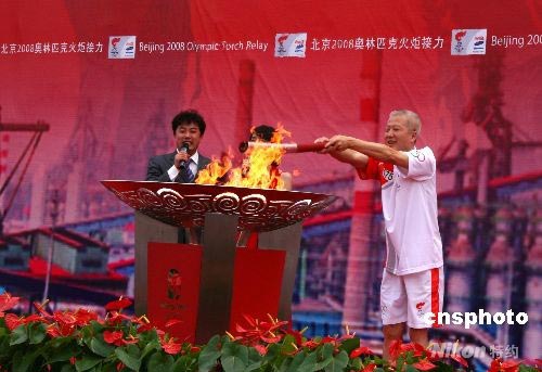7月18日上午,北京奧運火炬圓滿結束了在“鋼城”遼寧鞍山的傳遞。圖為最后一棒火炬手聞寶滿點燃圣火盆。 中新社發(fā) 周兆軍 攝