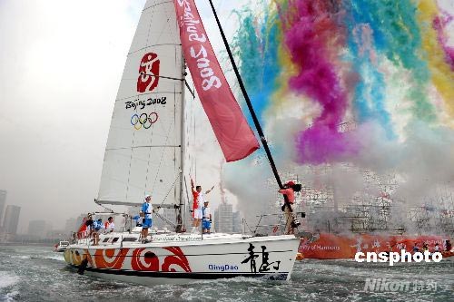 圖:"彩云"相伴 奧運圣火在青島海上傳遞