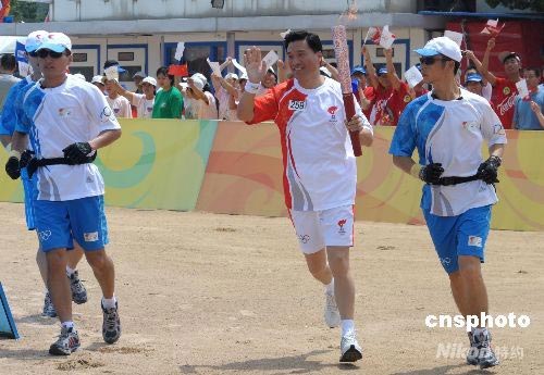 7月21日,奧運(yùn)火炬在山東青島傳遞,最后一棒火炬手青島市委副書記、市長、奧帆委主席夏耕跑進(jìn)傳遞終點(diǎn)青島第一海濱浴場(chǎng),隨后他點(diǎn)燃圣火盆,青島傳遞結(jié)束。 中新社發(fā) 廖攀 攝