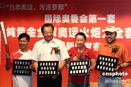 7月23日,奧運(yùn)火炬手許海峰(左二)、王勇峰(右一)、金晶(右二)和劉超英(左一)展示奧運(yùn)火炬大全套藏品。當(dāng)天,由國際奧委會(huì)和北京奧組委授權(quán)發(fā)行的“純黃金全球奧運(yùn)火炬大全套”紀(jì)念條藏品在北京面世。該藏品收集了奧運(yùn)會(huì)開辦至今的共17支火炬,正面火炬由浮雕工藝制作而成,背面為該屆奧運(yùn)會(huì)會(huì)徽和奧林匹克五環(huán)標(biāo)志。中新社發(fā) 盛佳鵬 攝