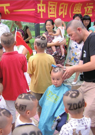 昨天,吳大勝(右一)正在一名小朋友頭上“創(chuàng)作”。北京市民吳大勝這幾天忙著免費(fèi)為小區(qū)的孩子理“奧運(yùn)頭”,以迎接第29屆奧運(yùn)會(huì)。他在孩子們的頭上理出多種圖案,受到歡迎。