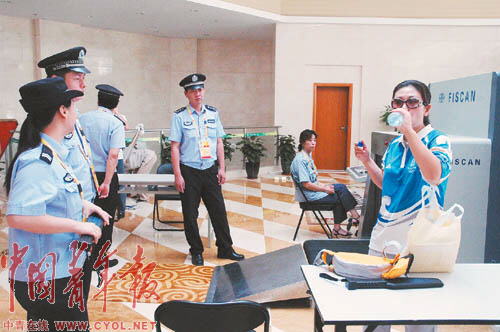 由于目前上海體育場(chǎng)實(shí)施全封閉管理,必須憑有效證件才能進(jìn)入封閉區(qū)域,記者佩戴著奧運(yùn)會(huì)注冊(cè)記者證進(jìn)入上海體育場(chǎng)。在工作人員的安檢通道:首先,要在專門的驗(yàn)證機(jī)器上檢查證件的真實(shí)性;接著,從兩根黑色柱子中間穿過(guò),而這兩根很不起眼的黑色柱子卻是非常厲害的核生化檢測(cè)儀器,任何一點(diǎn)放射性物質(zhì)都可以檢測(cè)出來(lái);隨后,就會(huì)通過(guò)和機(jī)場(chǎng)相同的安檢門,如果身上攜帶了金屬物品,儀器就會(huì)發(fā)出警報(bào),工作人員就會(huì)手持安全檢查儀進(jìn)行進(jìn)一步檢查,而行李則須從X光物品檢查儀通過(guò)。而更嚴(yán)格的是,進(jìn)入奧運(yùn)場(chǎng)所的人員攜帶的手機(jī)、手提電腦都必須進(jìn)行開(kāi)機(jī)測(cè)試,攜帶的飲料則必須開(kāi)瓶試飲一口,至于打火機(jī)則不得帶入。