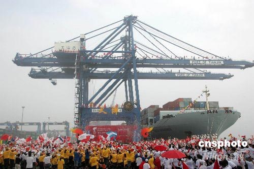 圖:奧運(yùn)火炬在中國北方最大港口傳遞