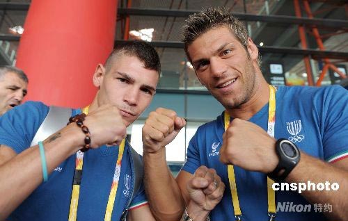8月1日,即將參加北京奧運(yùn)會(huì)的意大利拳擊手飛抵北京首都國際機(jī)場。圖為意大利拳擊手valentino oomenico(左)與隊(duì)友在一起。 中新社發(fā) 陳文 攝
