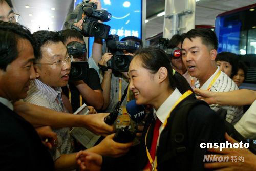 曾摘得2007年德國斯圖加特體操世錦賽女子跳馬銀牌的朝鮮體操名將洪淑貞(中),隨朝鮮奧運代表團(tuán)一起抵達(dá)北京備戰(zhàn)奧運會。