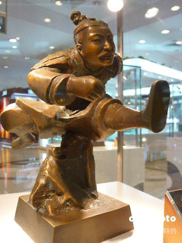 2008年8月2日,在北京一商城內(nèi),一套具有中國特色的名為“尚勇”的兵馬俑運(yùn)動雕塑套裝和市民見面,該禮品是專門為迎接北京奧運(yùn)開發(fā)的中國特色禮品。該款雕塑將籃球、足球、體操、跨欄、棒球五種現(xiàn)代奧運(yùn)項(xiàng)目與秦兵馬俑相結(jié)合,賦予古老藝術(shù)元素以新的生命。雕塑保留了兵馬俑外披鎧甲、翹首仰頸、氣宇軒昂等待出征的氣勢。雕塑主體與底座連為一體,使用青銅鑄造完成。 中新社發(fā) 樊甲山 攝