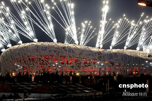 8月2日晚,北京奧運開幕式第二次彩排在國家體育場“鳥巢”舉行。圖為“鳥巢”試放煙花。 中新社發(fā) 王東明 攝