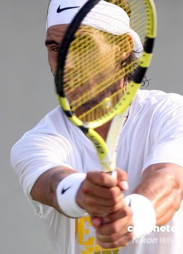 西班牙網(wǎng)球巨星納達(dá)爾在北京奧運(yùn)網(wǎng)球賽場積極備戰(zhàn)。 中新社發(fā) 武仲林 攝