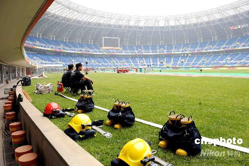圖為天津“水滴”體育場(chǎng)內(nèi)加強(qiáng)安保工作。 中新社發(fā) 陳文 攝