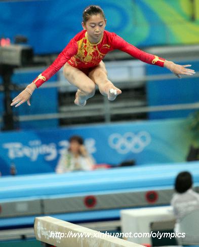 8月7日,中國女子體操隊在國家體育館進行賽臺訓(xùn)練。 新華社記者林慧攝