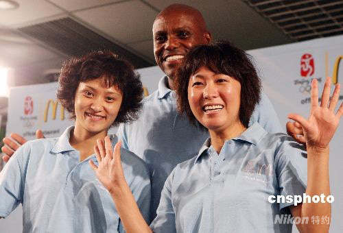 8月7日,在北京奧林匹克公園舉行了傳統(tǒng)的“巨無霸制作大賽”,并為比賽的優(yōu)勝者頒發(fā)“獎(jiǎng)牌”。美國(guó)9枚奧運(yùn)短跑金牌得主卡爾·劉易斯、中國(guó)奧運(yùn)冠軍王軍霞、高敏,與麥當(dāng)勞全球奧運(yùn)團(tuán)隊(duì)成員等一起,共同參加了巨無霸漢堡制作大賽。圖為王軍霞(右一)、高敏(左一)與卡爾·劉易斯出席“麥當(dāng)勞巨無霸制作大賽”。 中新社發(fā) 錢興強(qiáng) 攝