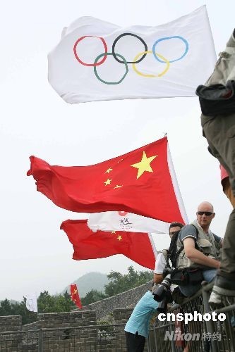 圖為奧運旗幟在長城上高高飄揚。中新社發(fā) 武仲林 攝