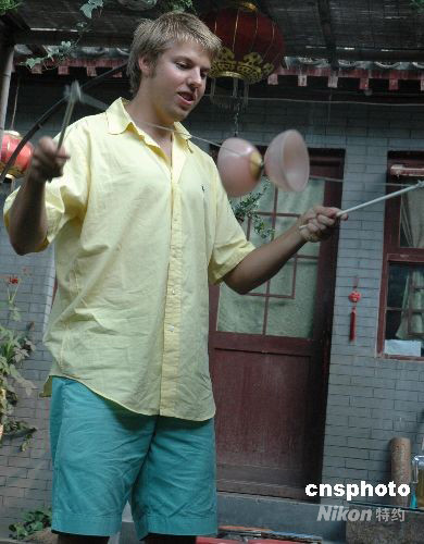 奧運(yùn)會(huì)期間,北京將迎來四十五萬中外游客。圖為8月9日下午一美國青少年游覽北京金絲胡同的一座四合院時(shí),學(xué)主人玩起了抖空竹游戲。 中新社發(fā) 王辛莉 攝