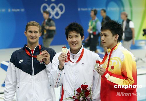 中國(guó)選手張琳(右)以3分42秒44獲得銀牌,為中國(guó)泳軍在本屆奧運(yùn)會(huì)獲得第一枚獎(jiǎng)牌,也實(shí)現(xiàn)中國(guó)男子游泳“零的突破”。美國(guó)選手拉森·詹森以4分42秒78獲得季軍。