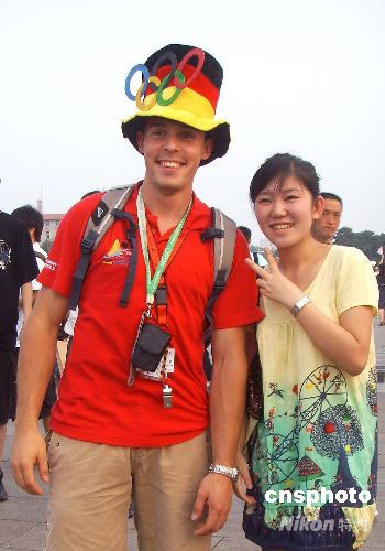8月9日,幾名參加北京奧運(yùn)會(huì)的德國(guó)運(yùn)動(dòng)員來(lái)到天安門廣場(chǎng)游覽,其中一位運(yùn)動(dòng)員頭戴的“奧運(yùn)五環(huán)”帽十分獨(dú)特醒目,引得周圍的游客竟相與他拍照合影。中新社發(fā) 玉龍 攝