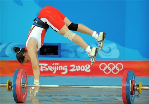 8月11日,阿爾巴尼亞選手羅梅拉·貝加伊試舉成功后興奮地翻起筋斗。當(dāng)日,北京奧運(yùn)會舉重女子58公斤級決賽在北京航空航天大學(xué)體育館舉行。